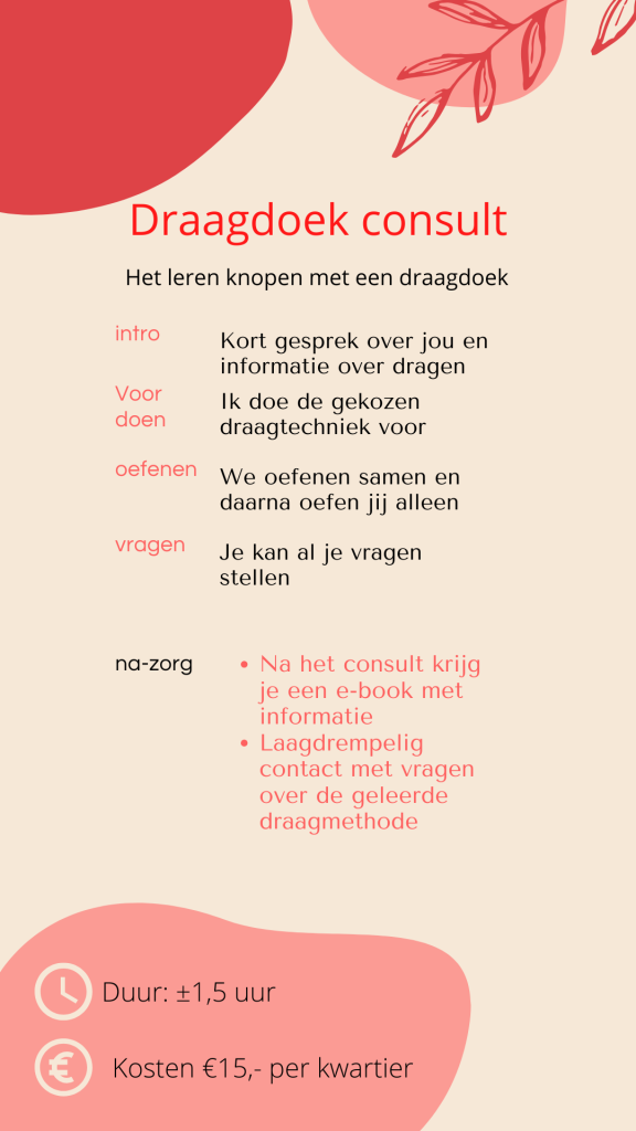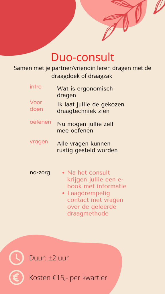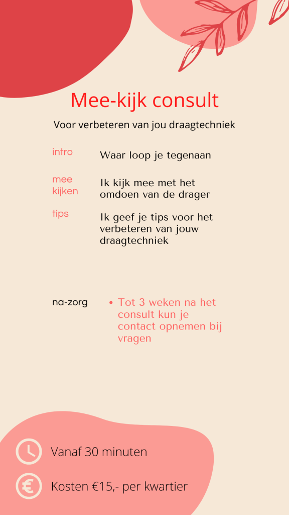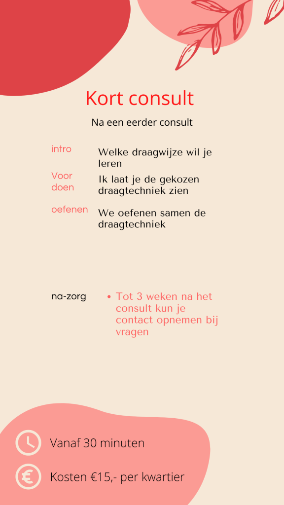 Ik werk met verschillende pakketten, op deze manier kan ik zorgen dat ik genoeg tijd reserveer voor jou draagconsult. Weet je niet zeker welk consult bij jou past of wil je toch liever iets anders? Vraag gerust naar de mogelijkheden. Al mijn consulten hebben dezelfde prijs per kwartier.